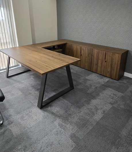 OCASIÓN: Mesa serie Piramid de 200x90 con faldón y estructura metálica en color Grafito y sobre tapa en color Roble Viejo y ala de mesa a juego de 100x60.