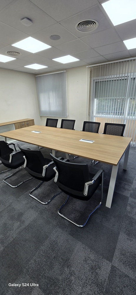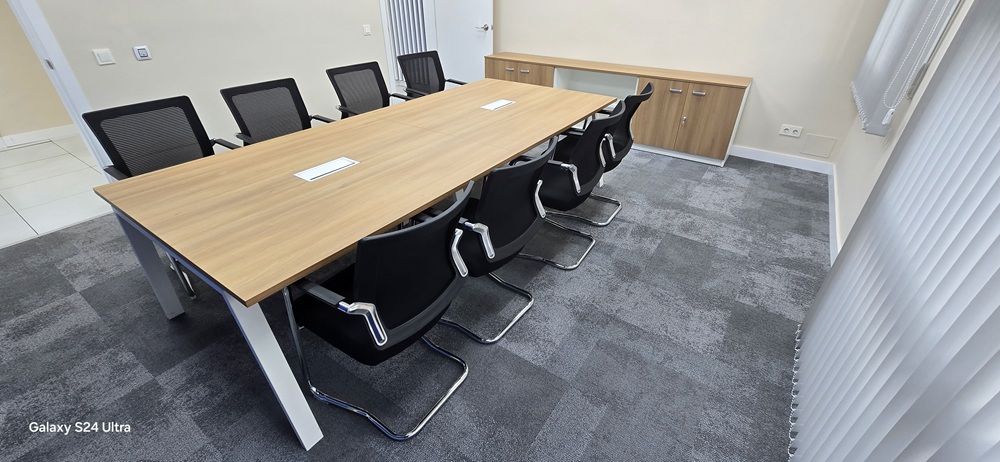 Mesa de reuniones con estructura en color Blanco y en dos sobre tapas en color Acacia Suave. con tapas pasa cables y canaleta electrificación.