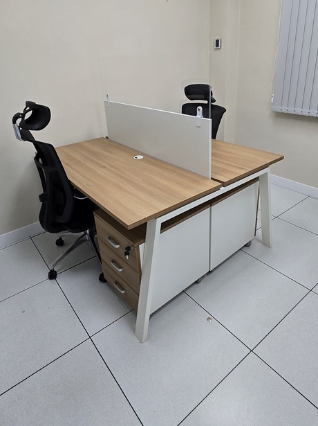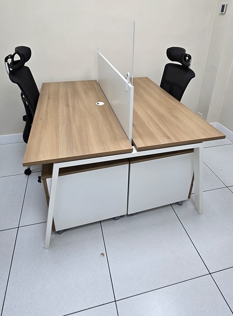 OCASIÓN: Multipuesto enfrentado para 2 personas, con estructura en color blanco y sobretapas en color Acacia Suave, orificios pasa-cable y canaleta electrificación, separador de melamina en color Blanco + separador de metracrilato